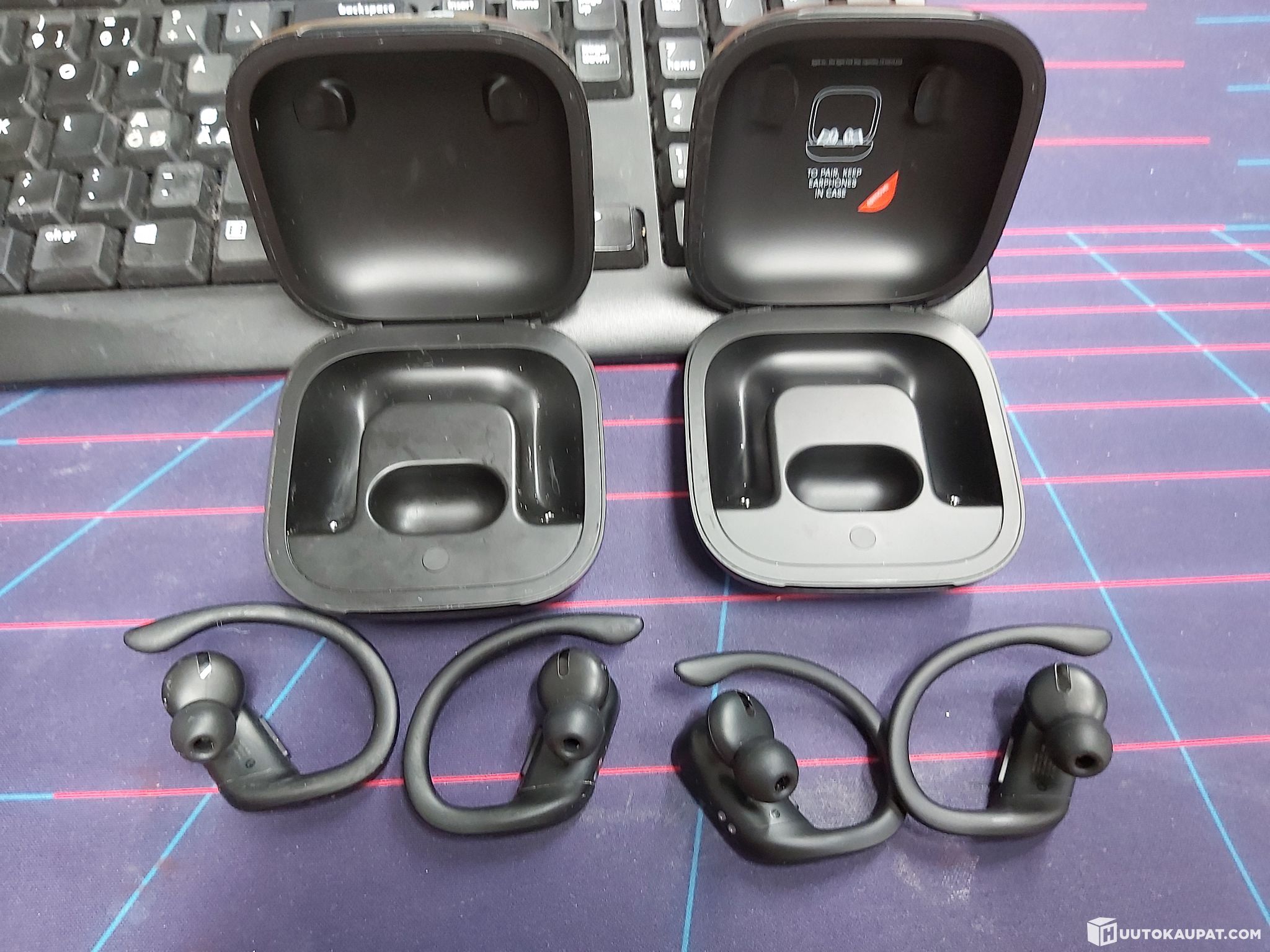 Käytetyt. Mukana kuulokkeet, latauskotelot ja laturit.