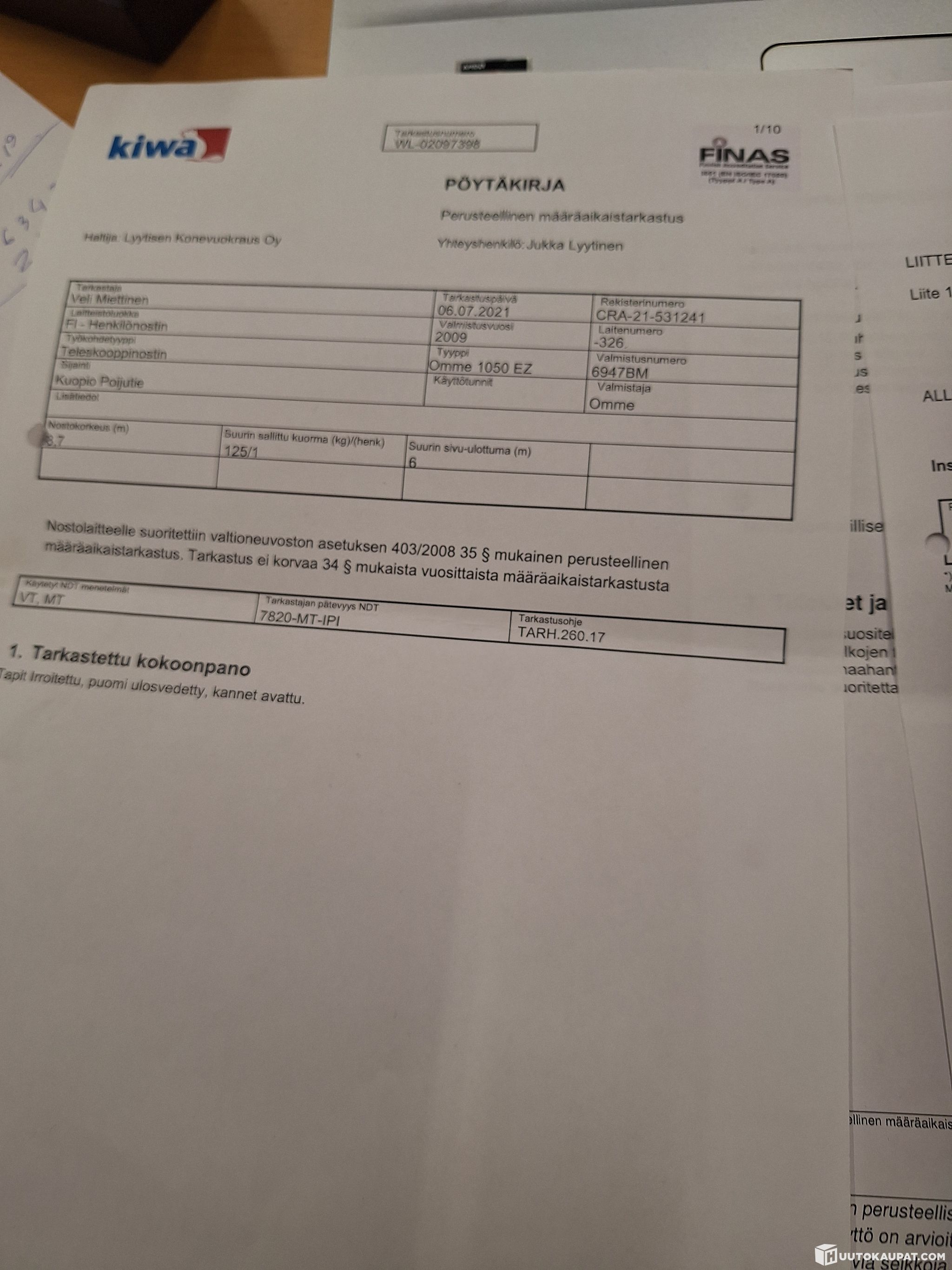 Nostin toimii 230 V valovirralla, on varustettu ajolaitteella ja sen kuljetusmitat ovat 5,9 metriä pitkä ja 1,95 metriä korkea. Tärkeimmät tekniset tiedot: Ajolaite: Voi siirtää työmaalla ilman autoa. Tuentaleveys: Noin 3,2 metriä. 10v katsastus voimassa 2031 (inspecta) Vuosikatsastus on voimassa