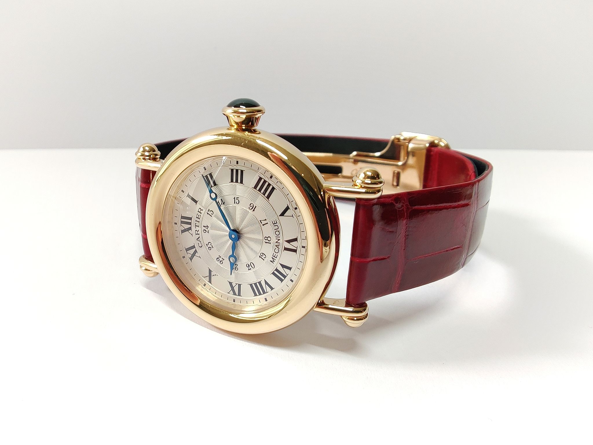 Näyttävä ja erittäin harvinainen Cartier Diabolo umpikultainen rannekello 750 18K. Täyshuollettu Cartierilla, mittatilauksena Cartierilla teetetty Lie-DeVin - alligaattorinnahkainen ranneke. Huollon arvo yli 1700€!
