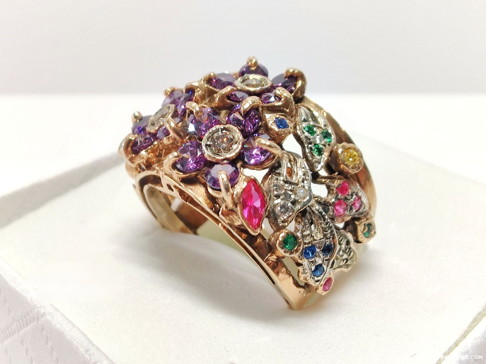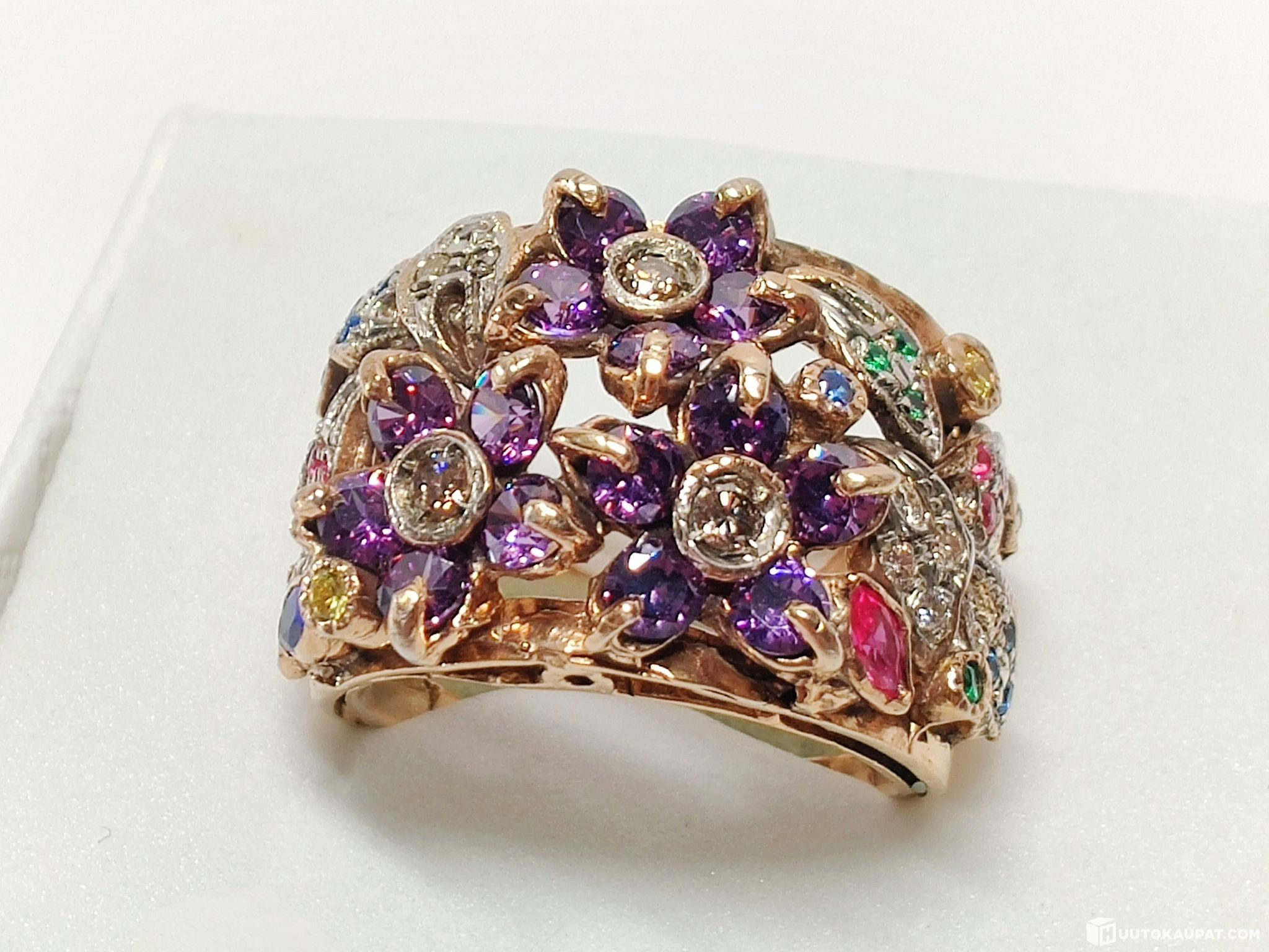 Todella näyttävä jalokivin ja timantein koristeltu naisten kultasormus 375 9k kultaa.