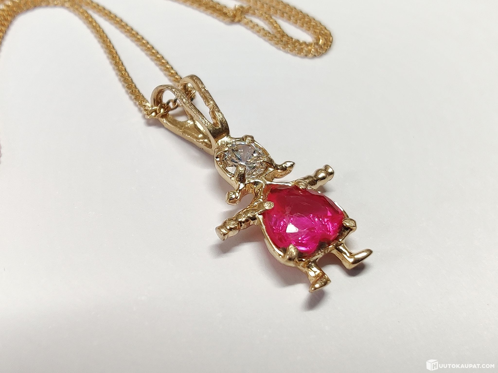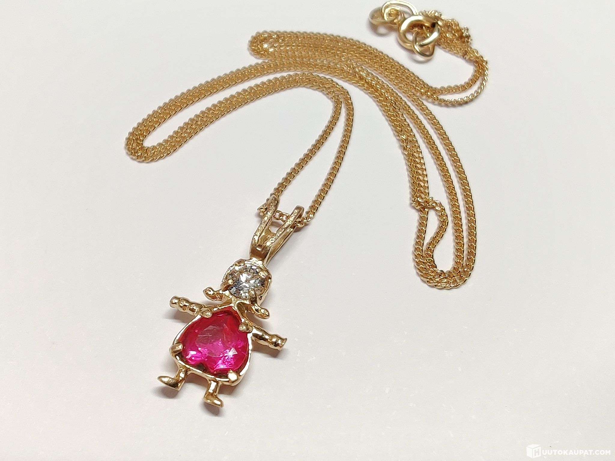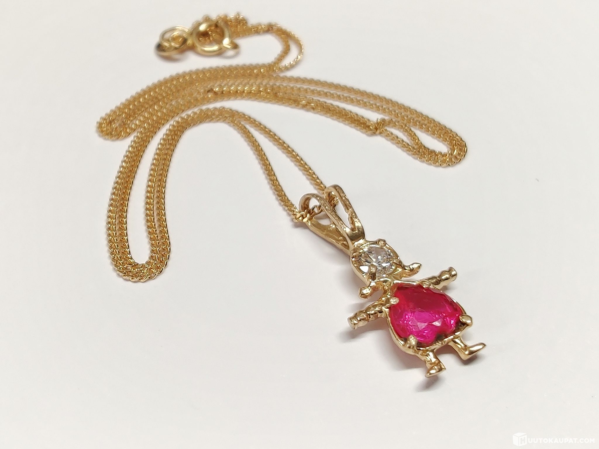 Kotimainen, rubiinikoristeinen lasten kaulariipus panssariketjulla 585 14k kultaa.