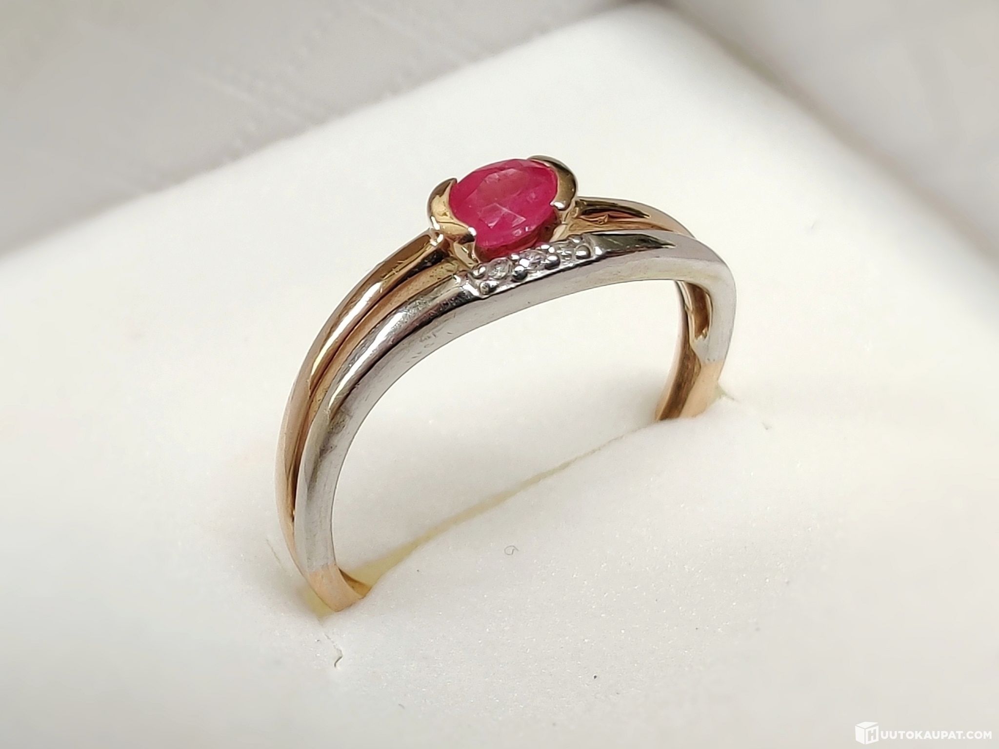 Todella kaunis timanttikoristeinen rubiinisormus 585 14k kelta- ja valkokultaa.