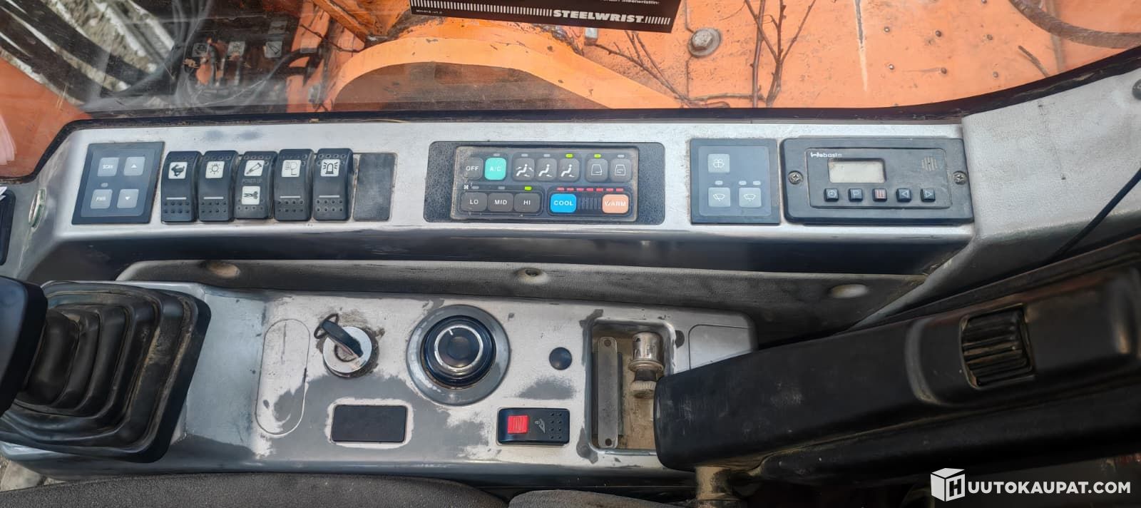 Tässä töissä oleva kone, ollut meillä käytössä vuosia ja konetta on korjailtu sieltä ja täältä milloin remontille tarvetta on ilmaantunut. Huollot on pyritty tekemään säännöllisesti. En lähde yksilöimään sen kummemmin. Koneessa on Steelwristin X18 pyörittäjä, rulla ohjauksella.