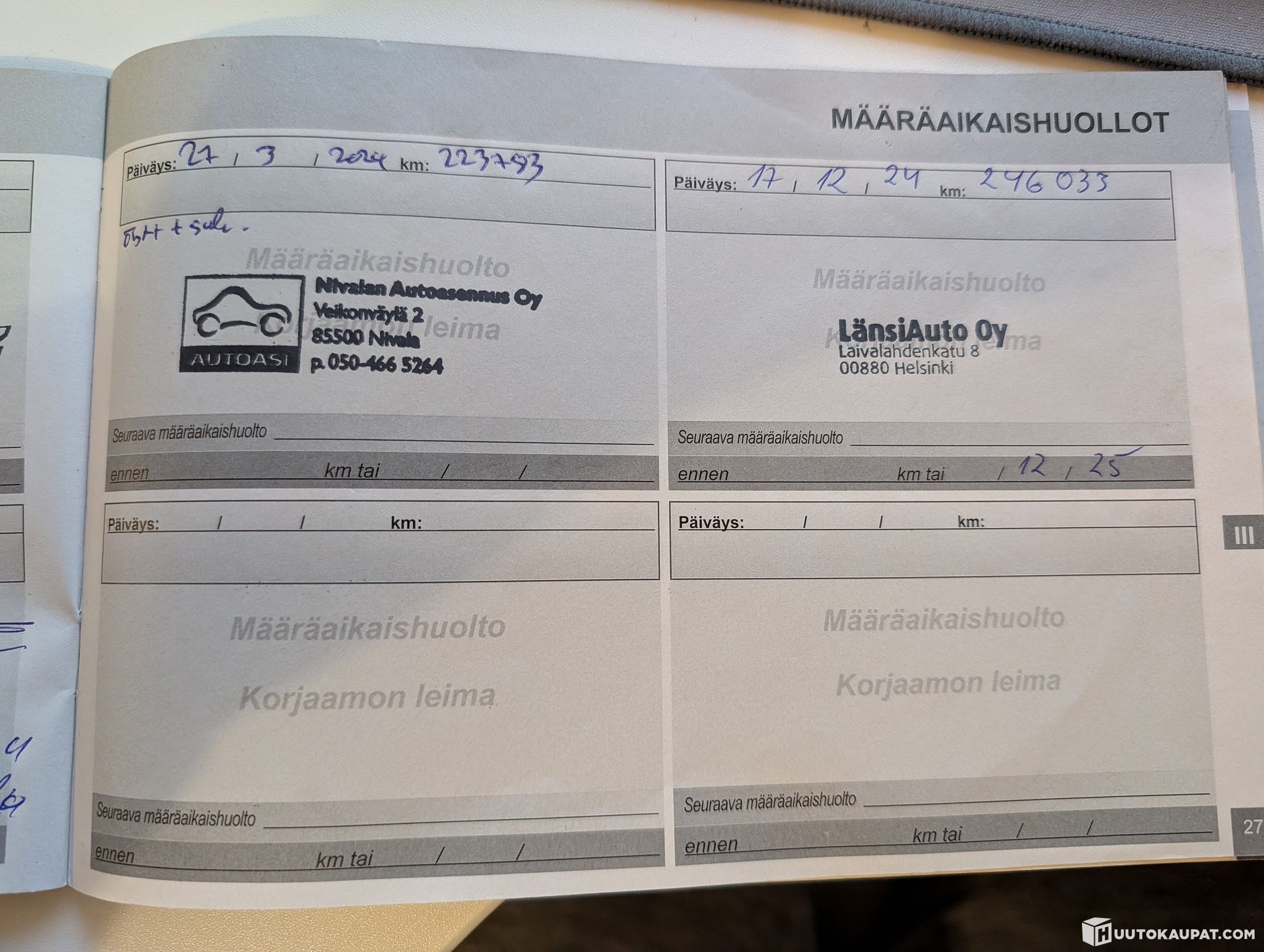 Autoa käytetty siihen mihin se on tehty, eli liikkumiseen, ja kilsoja on paljon, mutta on huollettu ja korjattu aina. Viimeisin vuosi ajeltu “vain” 25000 km. Katsastus reilun vuoden päästä, huolto seuraavaksi. Hintaa merkkihuollossa tulee 249 euroa. Tuulilasi vaihdettu tänä vuonna, eli hyvässä kuosissa. Kitkoissa on pintaa jonkin verran, mutta kesärenkaat on loppu. Aluvanteita kahdelle setille. Eli tiedossa olevat kulut seuraavalle puolelle vuodelle on max 249e huollosta + kesärenkaat.