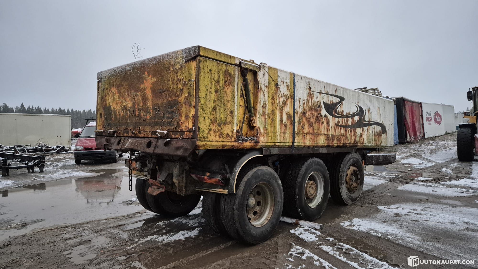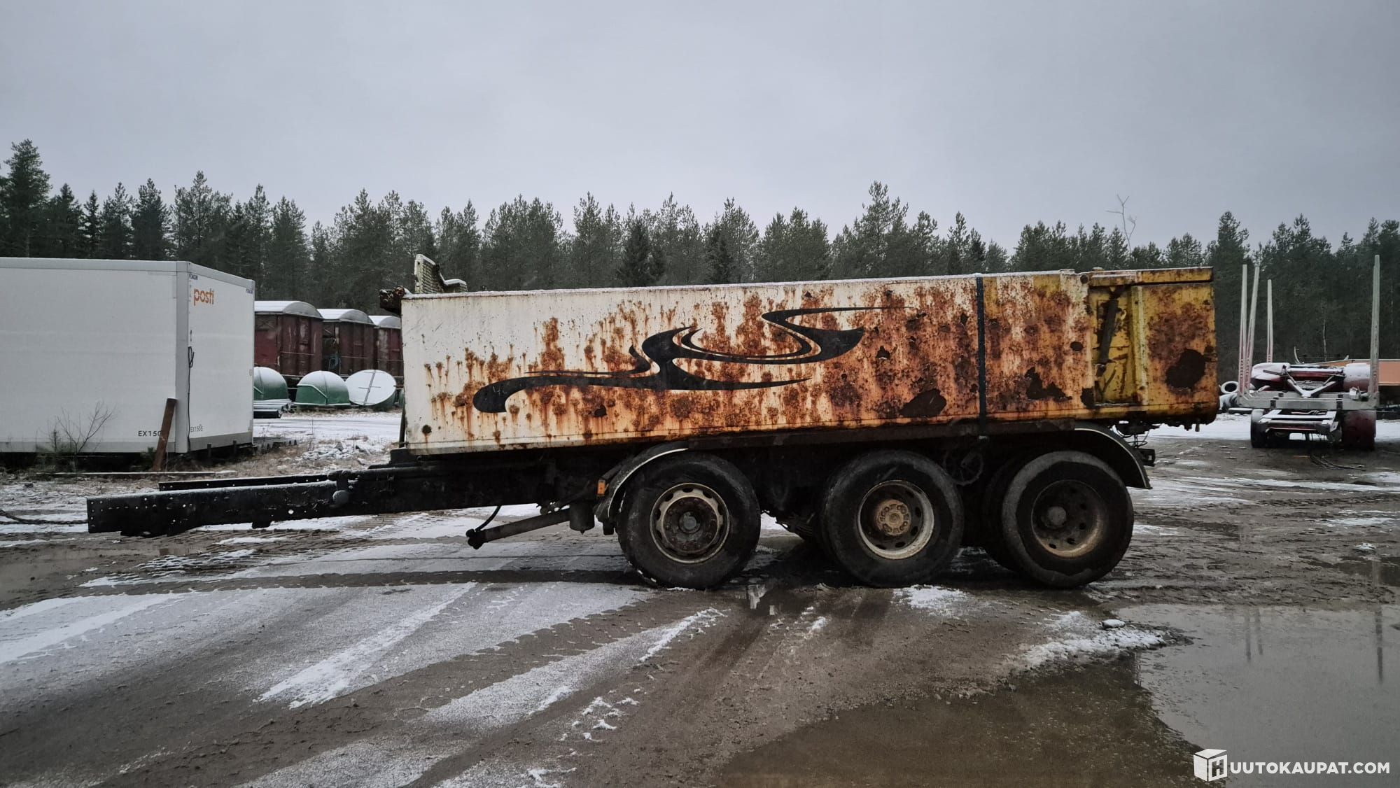Scania 4-sarja 2000 luvun vaihteesta. Rautajousi, rumpujarru. Lavan pituus noin 6m. Perä paikallaan mahdollisuus tehdä vetäväksi.