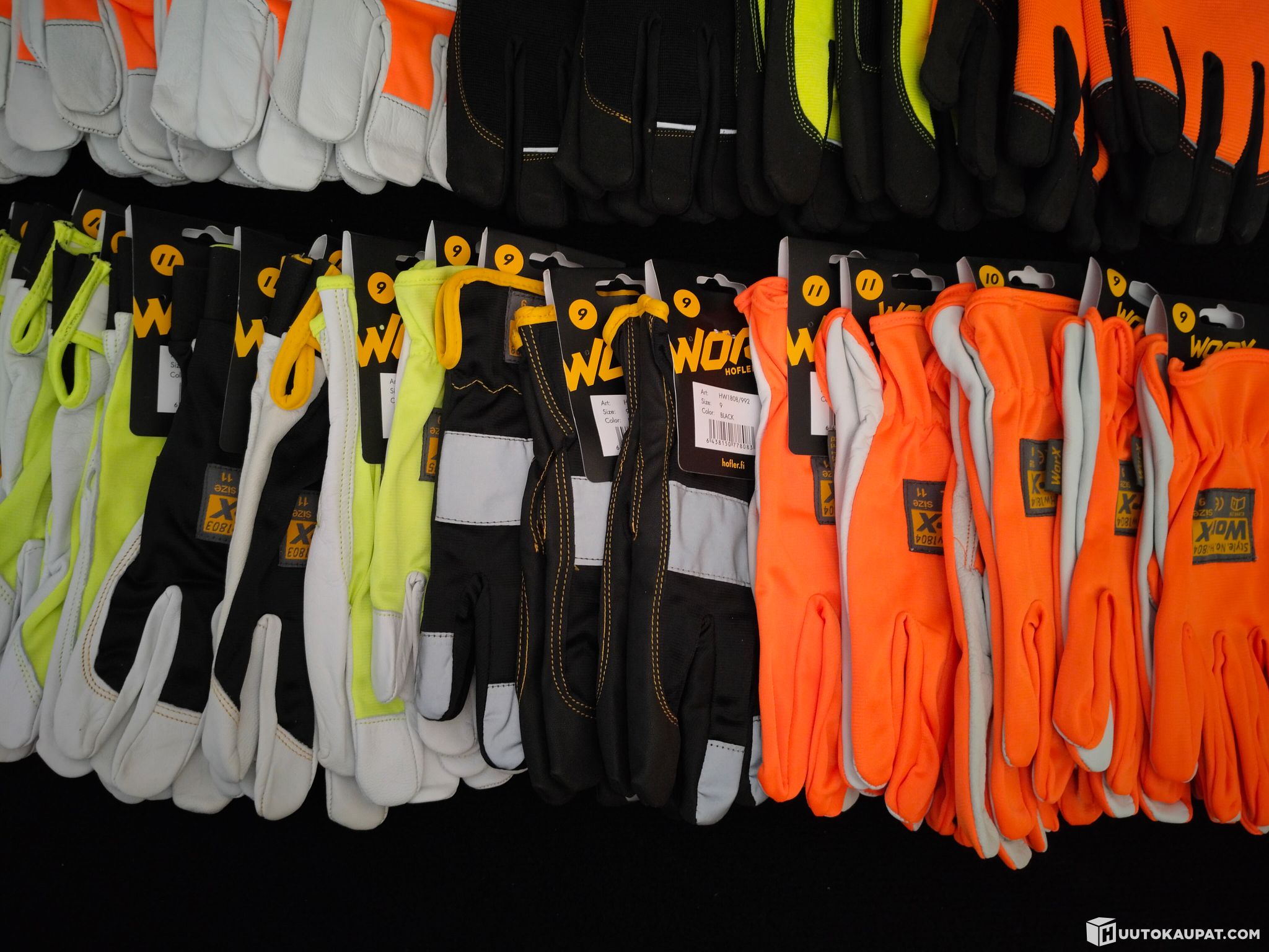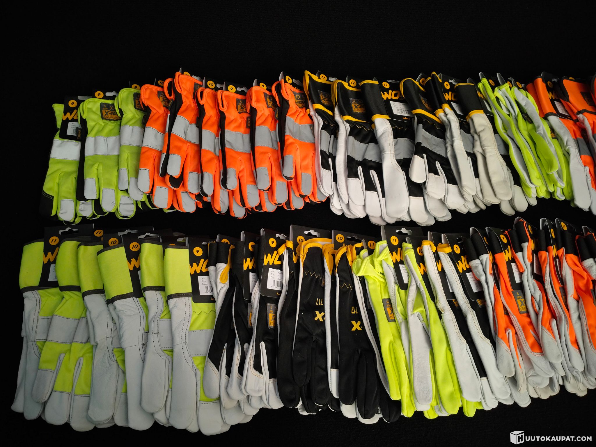 Mukana sekä kevyempiä työ/käsittelyhanskoja että vahvempia turvahanskoja heijastinnauhoilla sekä paksumpaa talvimallia.