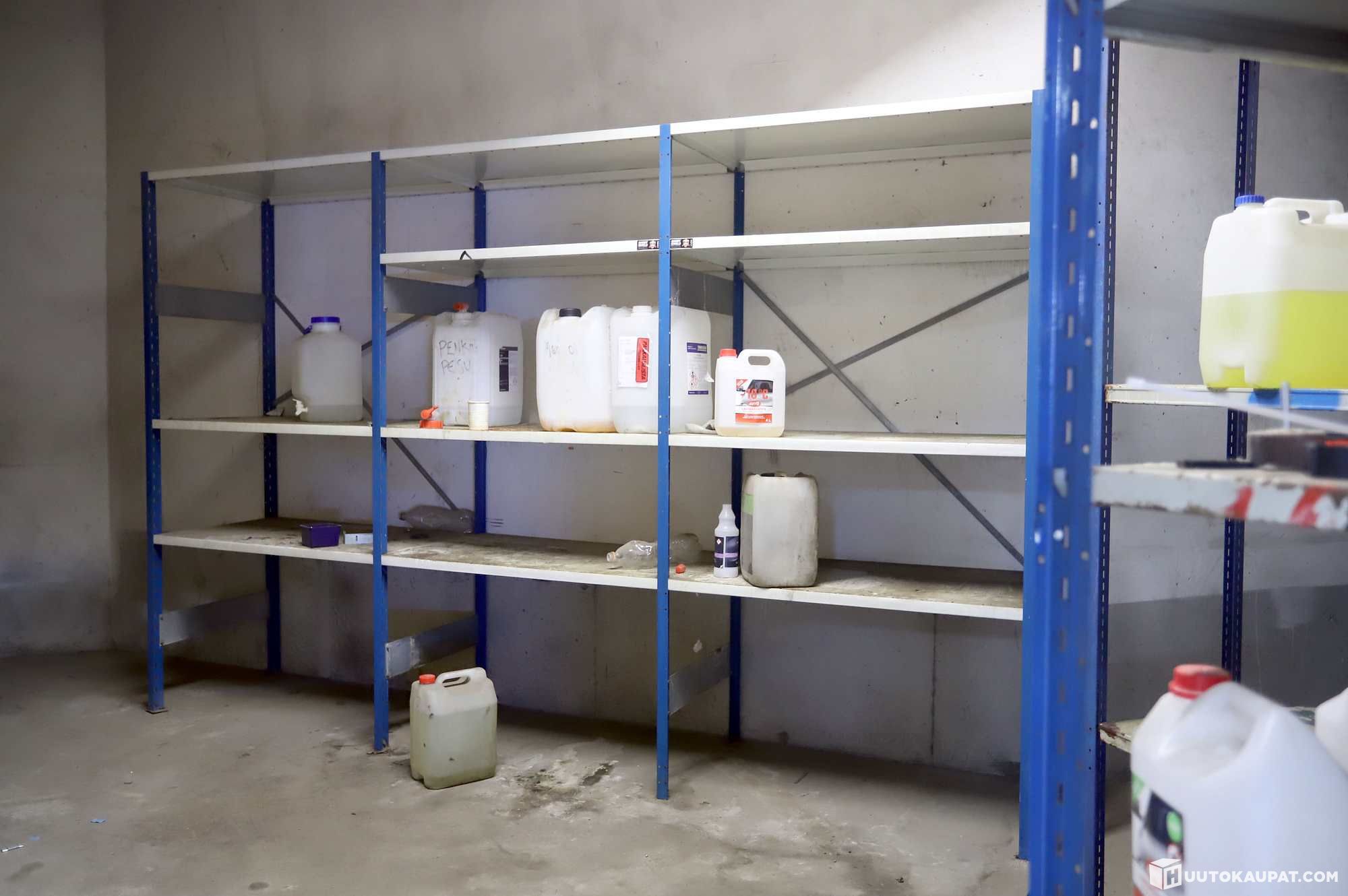 1 kpl kevyt peltihyllystö neljällä hyllyllä. Korkeus 155cm, leveys 75cm, syvyys 30cm. Toisessa päädyssä on kolhu.