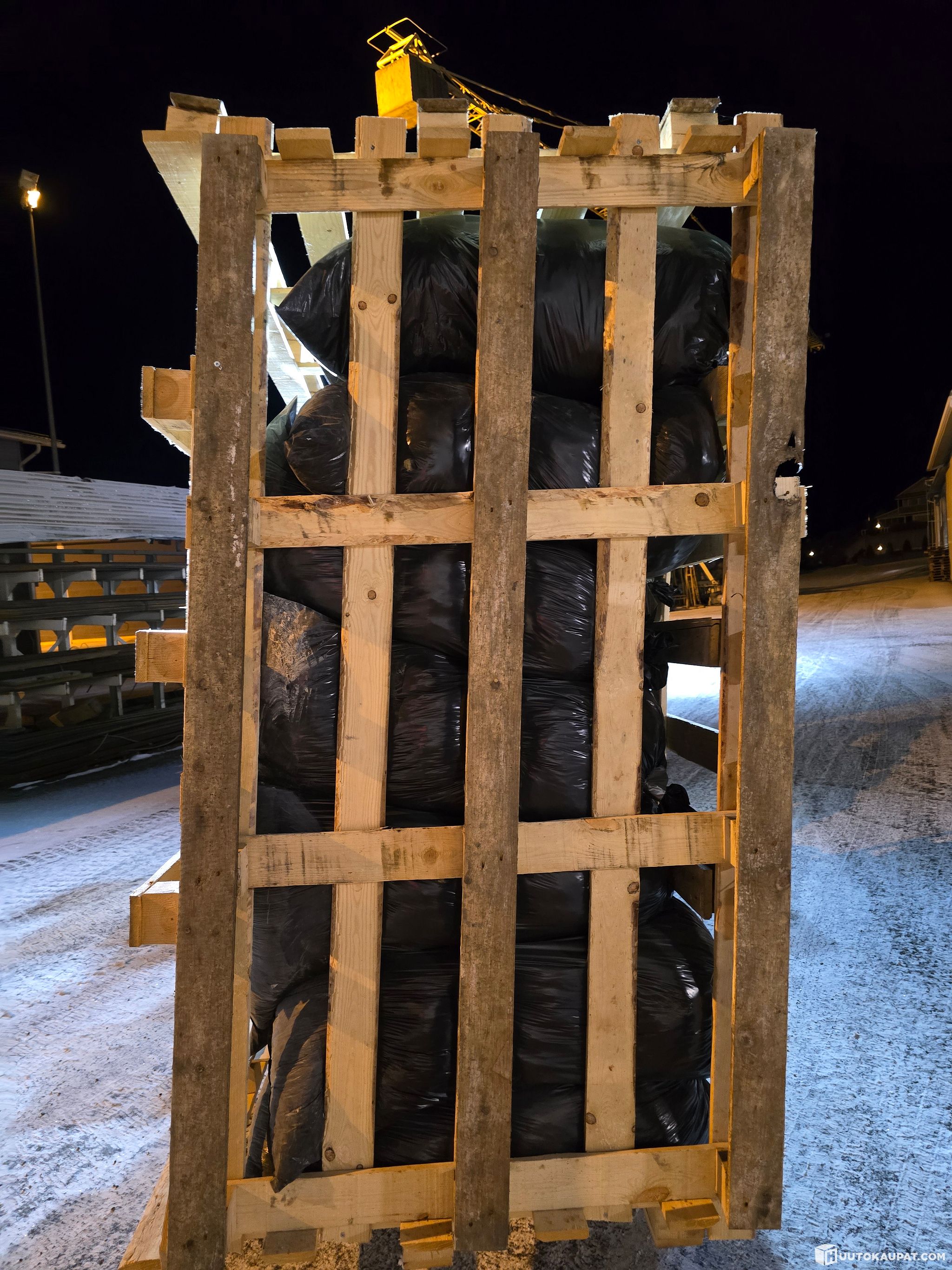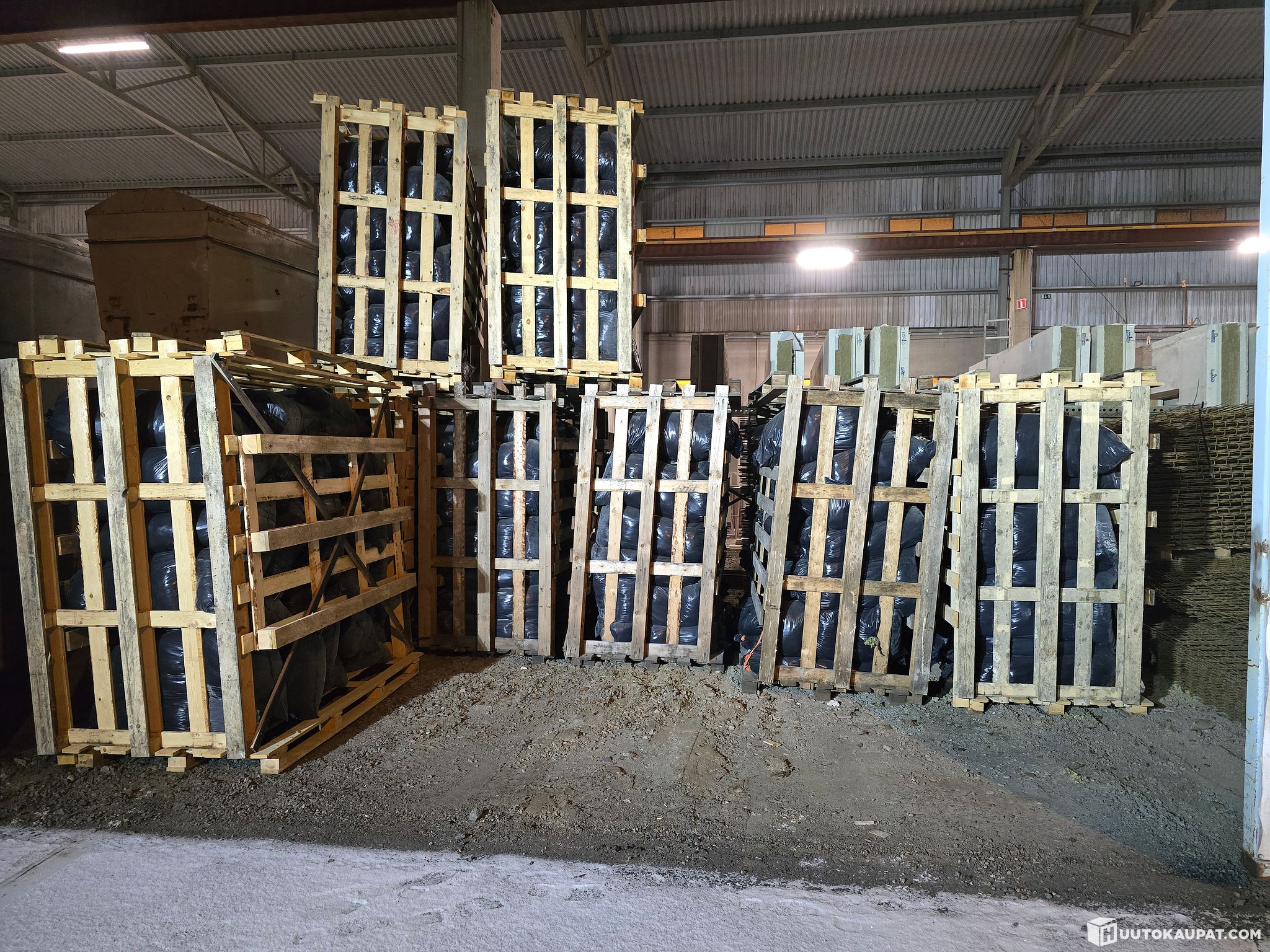 Lavalla n.30 säkkiä Parocin elementtikivivillasta rouhittua villaa.