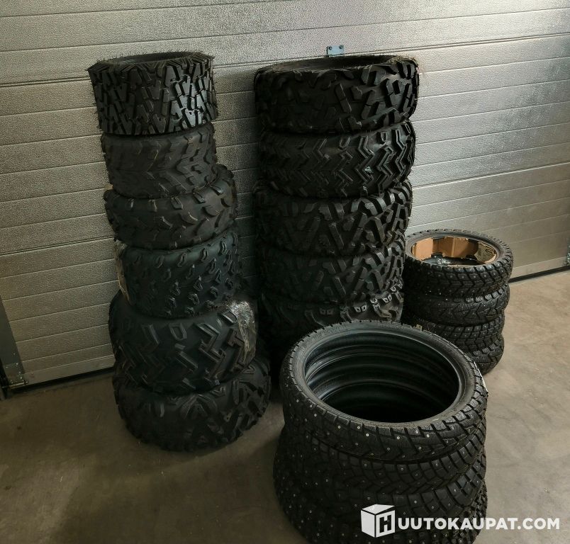 Renkaita mönkijöihin ja muihin ajoneuvoihin 21 kpl. Hinta kaupassa yli 2000 €.