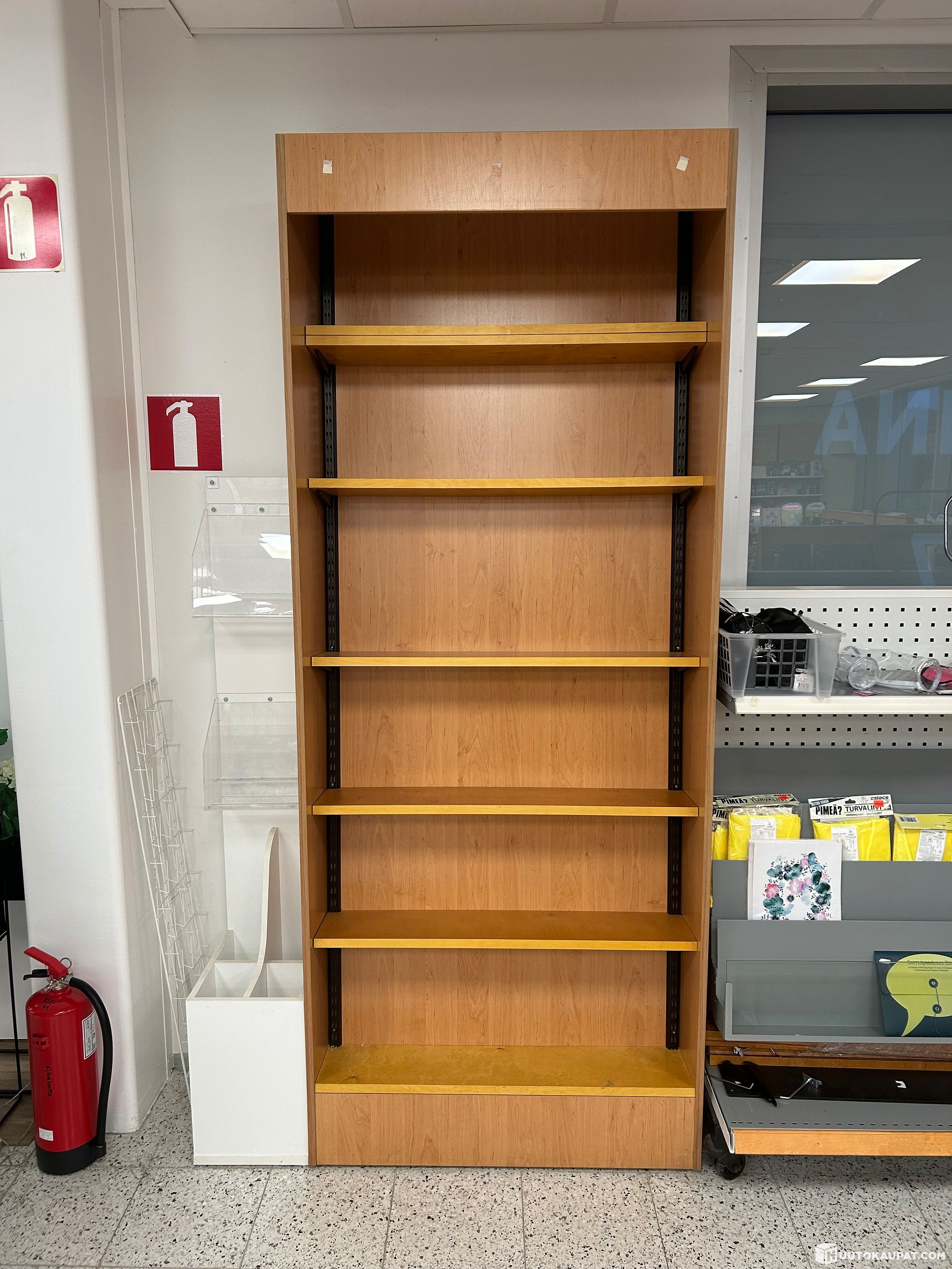 Korkea ja kapea hylly, L 55 cm x K 223 cm x S 35 cm, 1 kpl (kuva 3, kulmassa)