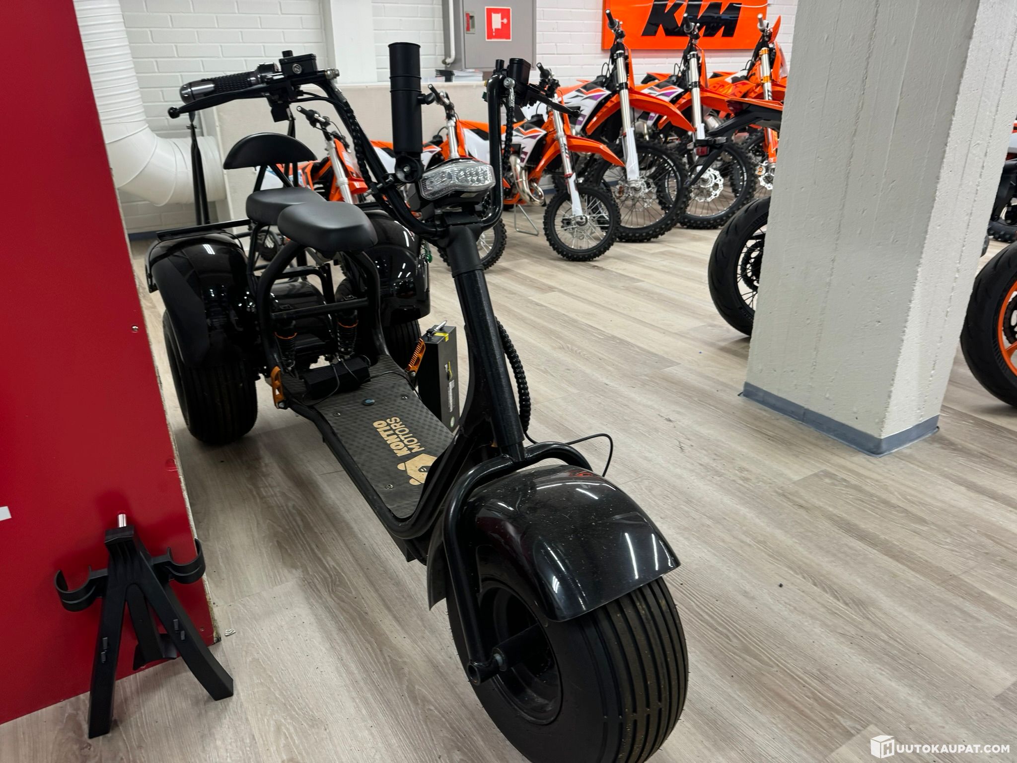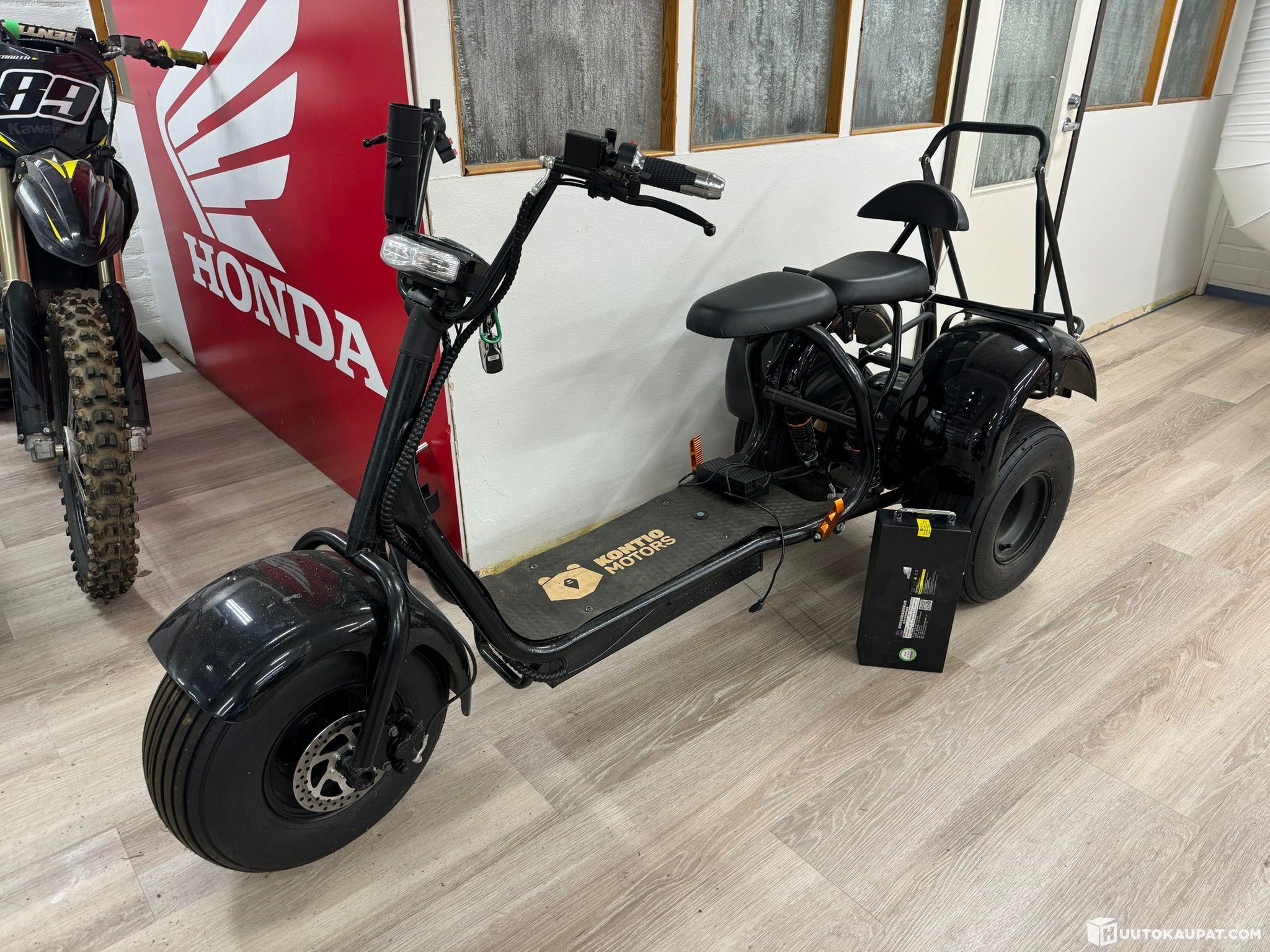 Kolmepyöräinen trike Kontio. Sähkökäyttöinen max 25 km/h kulkeva sähköskootteri. Ei vaadi ajokorttia eikä rekisteröimistä. Saa ajaa pyöräteillä. Kahdella akulla ja golfbägi telineellä!