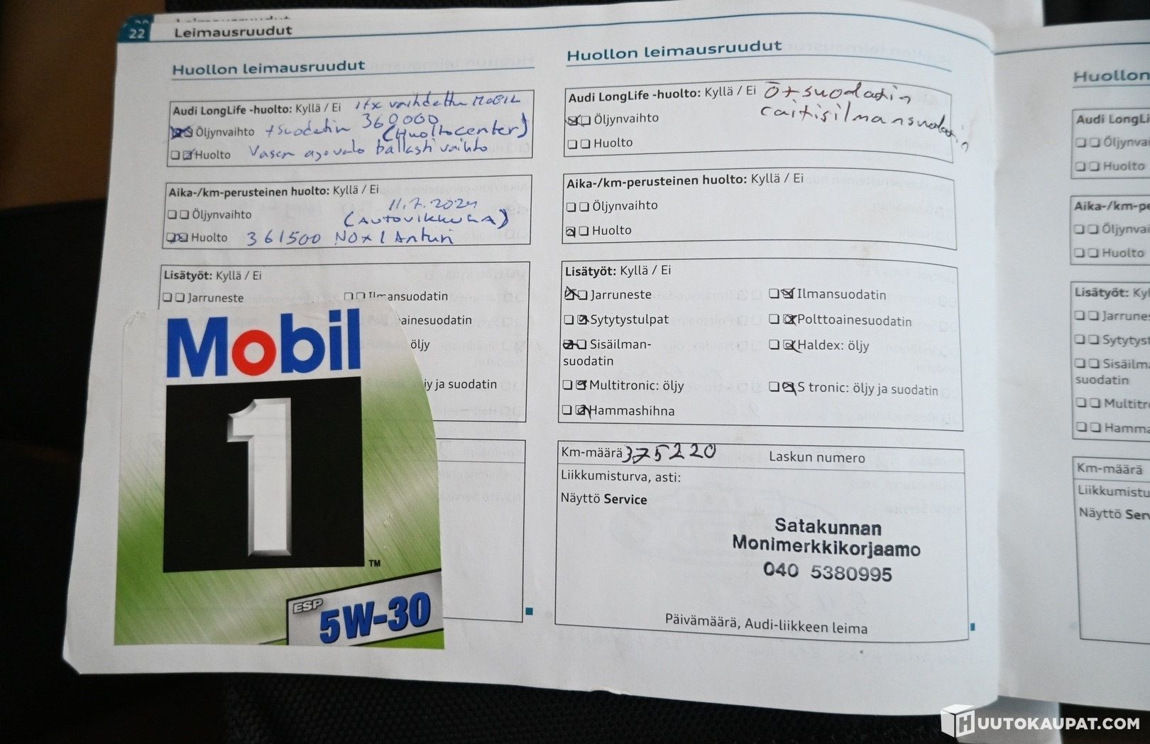 Viimeisin huolto: 375tkm