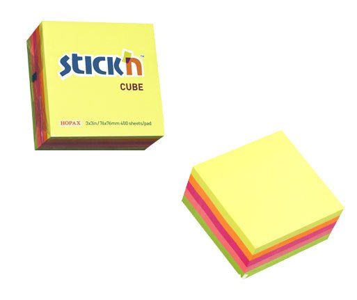 "Muistilappukuutiossa on 400 muistilappua viidessä neonvärissä. Yhden lapun koko on 76 x 76 mm."