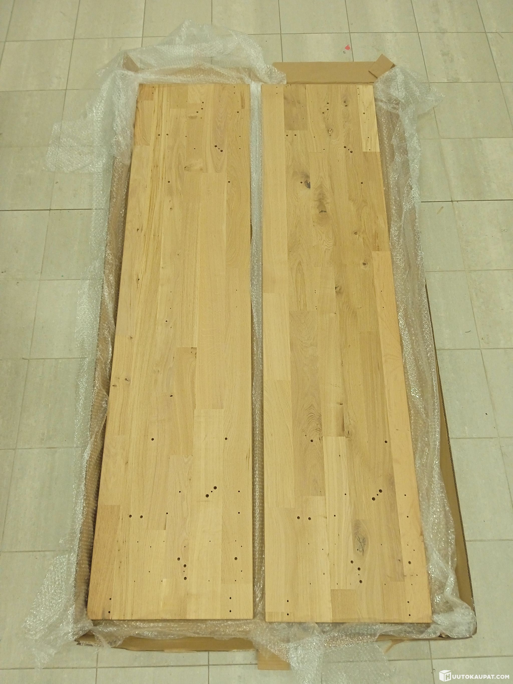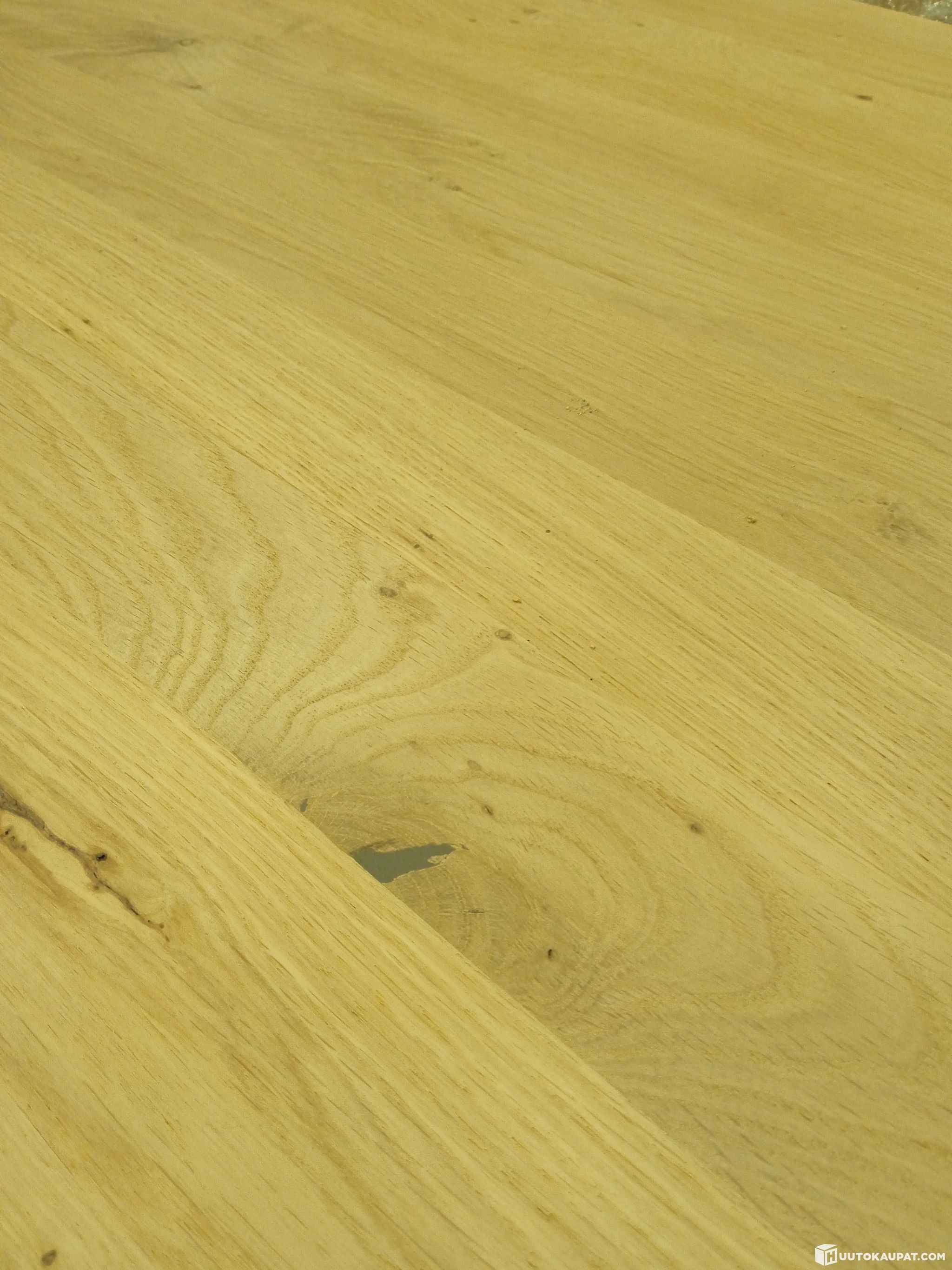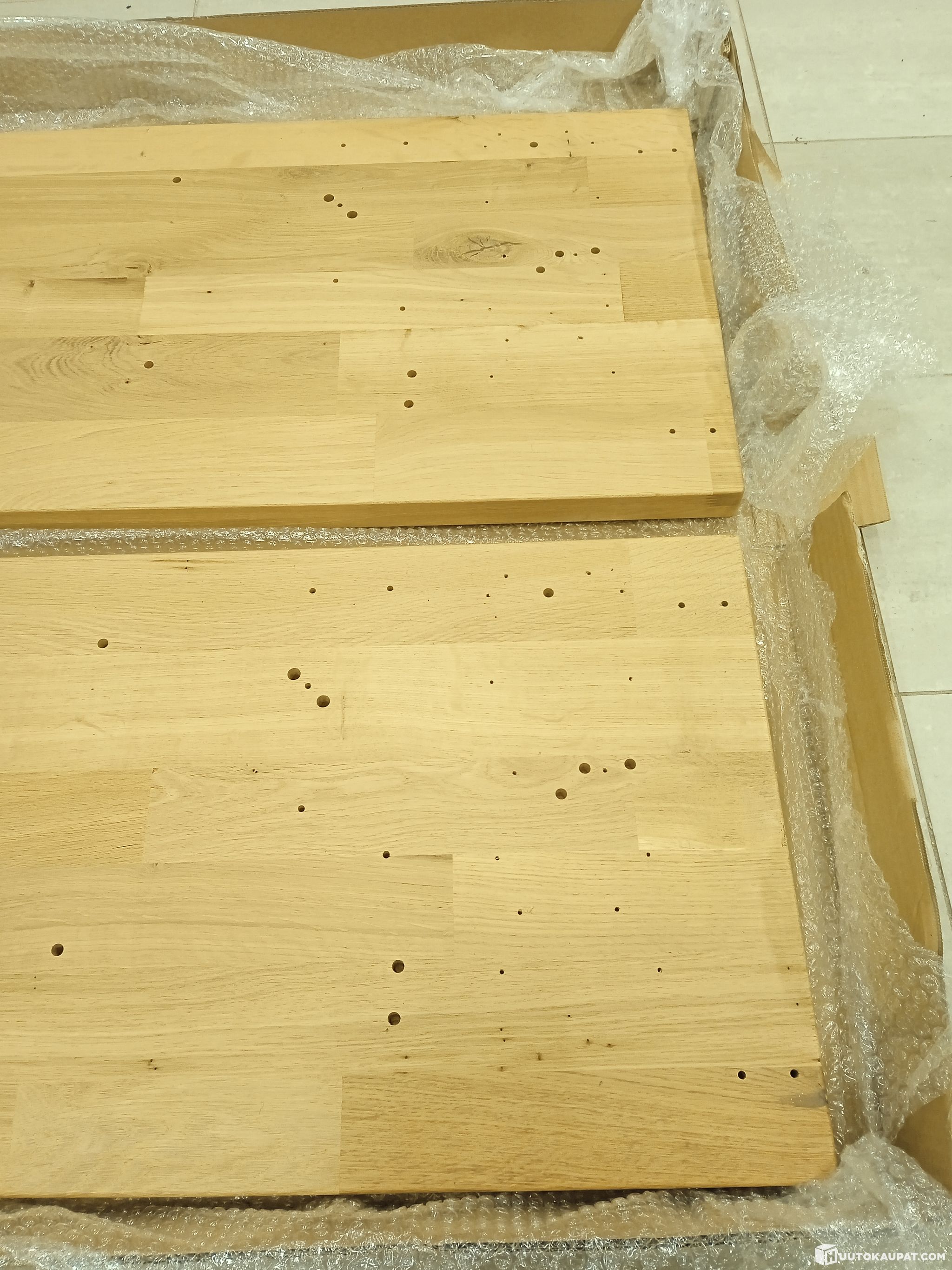 Massiivipuinen Tammi lankkupöydän kansi / Toisessa lankussa pieni jälki reunassa. Muutamia paikkauskohtia.