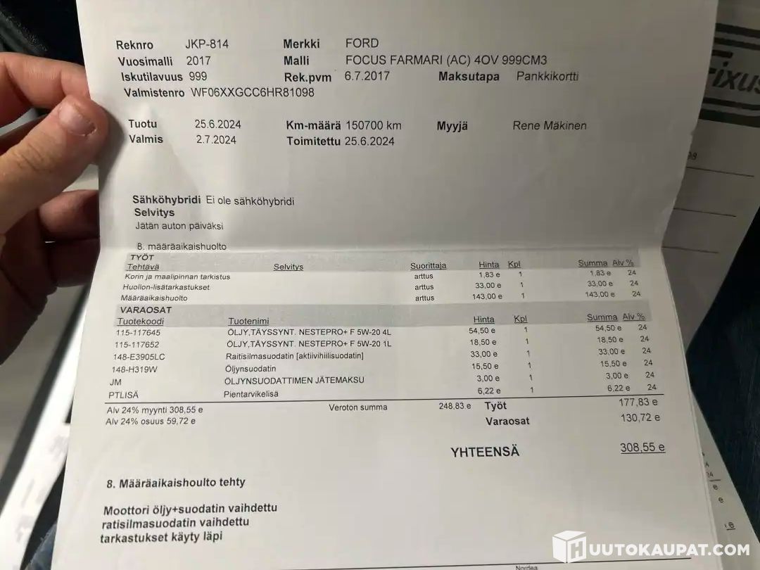 Huoltohistoria säännöllinen: 6km, 16tkm,28tkm, 53tkm, 82tkm, 108tkm, 131tkm,150tkm ja 166tkm