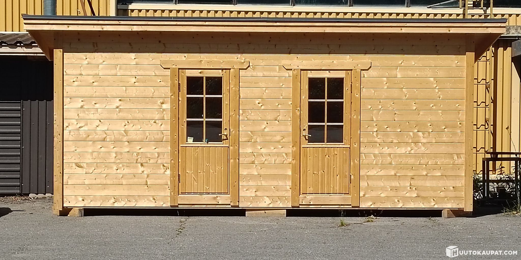 Pulpettikatto huopakatteella. Ovet ovat 8x19 kokoiset mökkiovet.