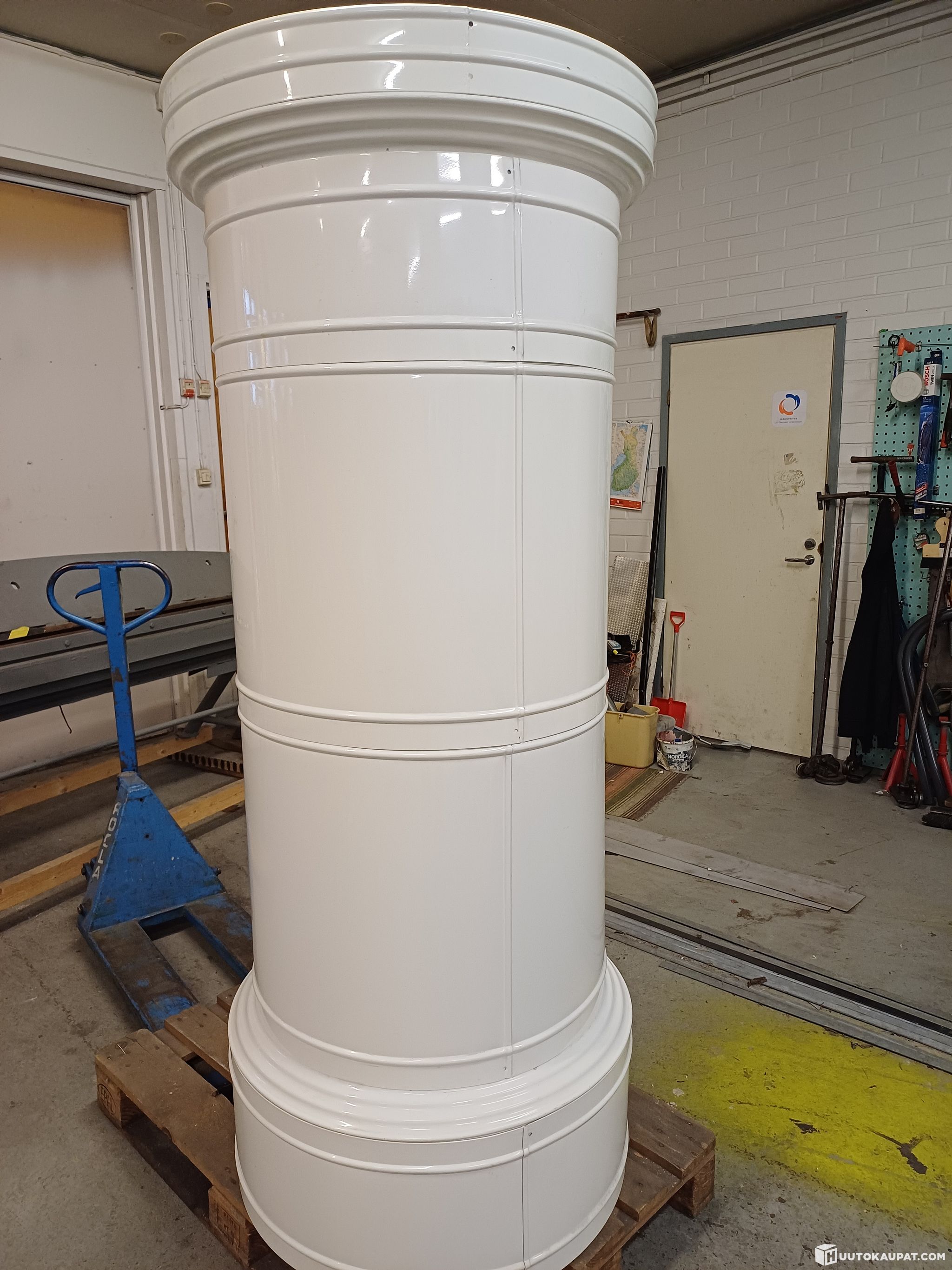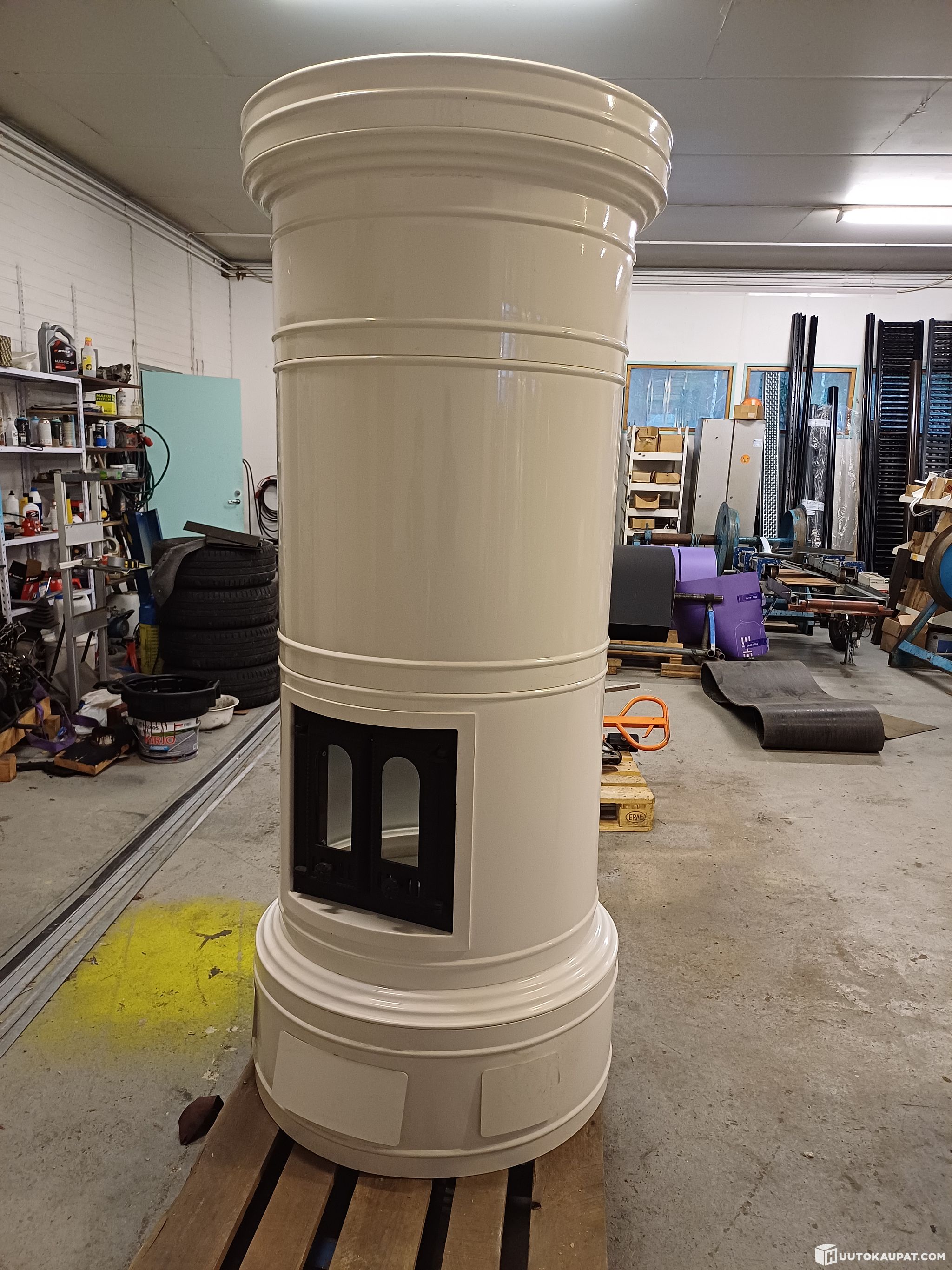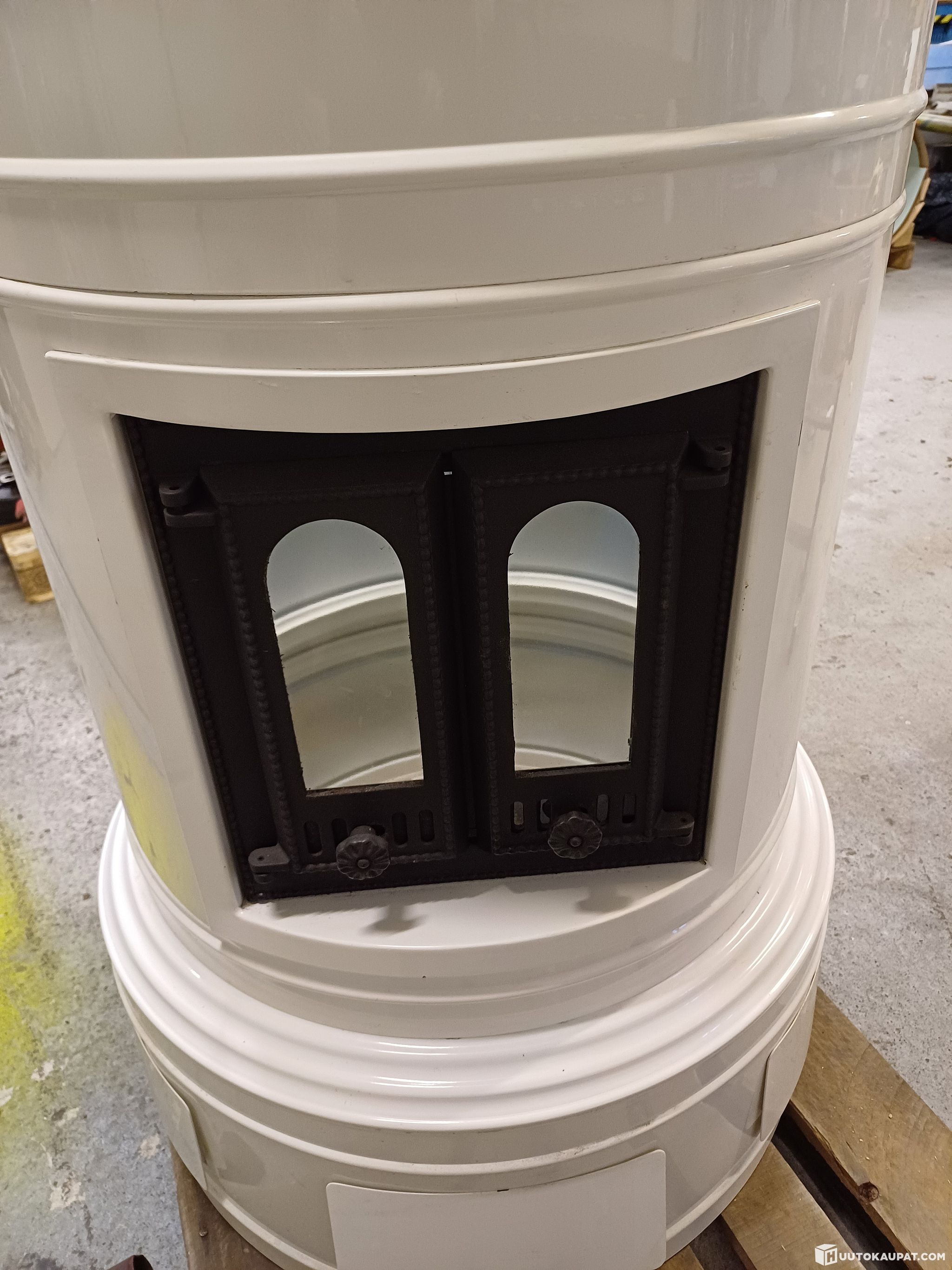 Siistit valkoiset (Vieno)pönttöuunin kuoret ja luukku, ollut esittelykohde ja kohde on käyttämätön muutamia pieniä naarmuja löytyy pulverimaalattu. Korkeus n. 1900mm halkaisija leveämmästä kohtaa n.800mm