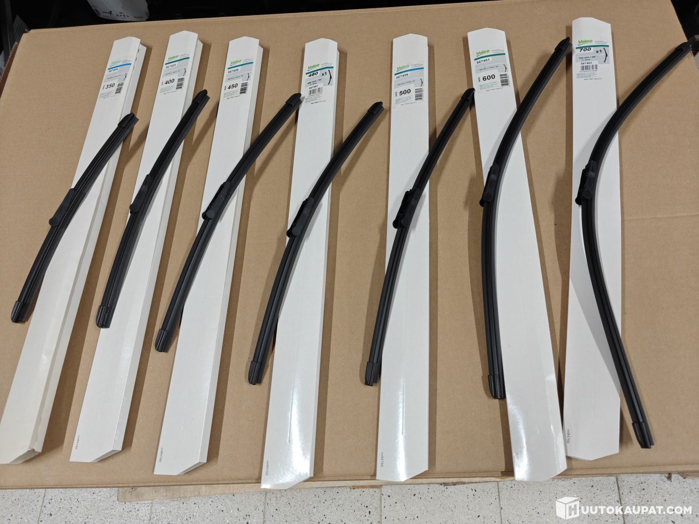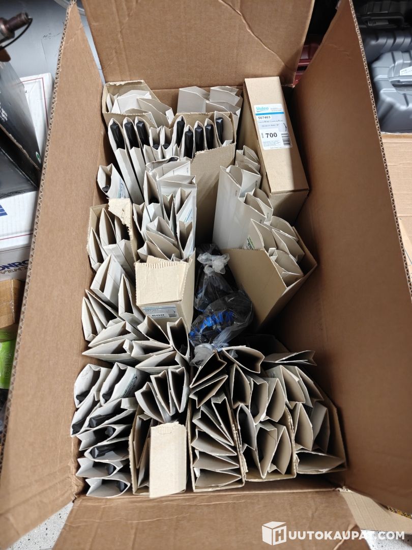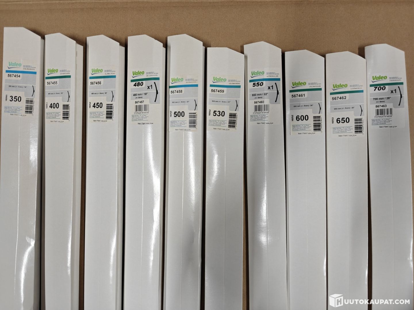 Iso laatikollinen eri pituisia Valeon pyyhkijänsulkia, joissa irralliset sovitekappaleet. kohteen kuvissa lähikuvat sulkien tuotenumeroista sekä kuvat kiinnityksistä.