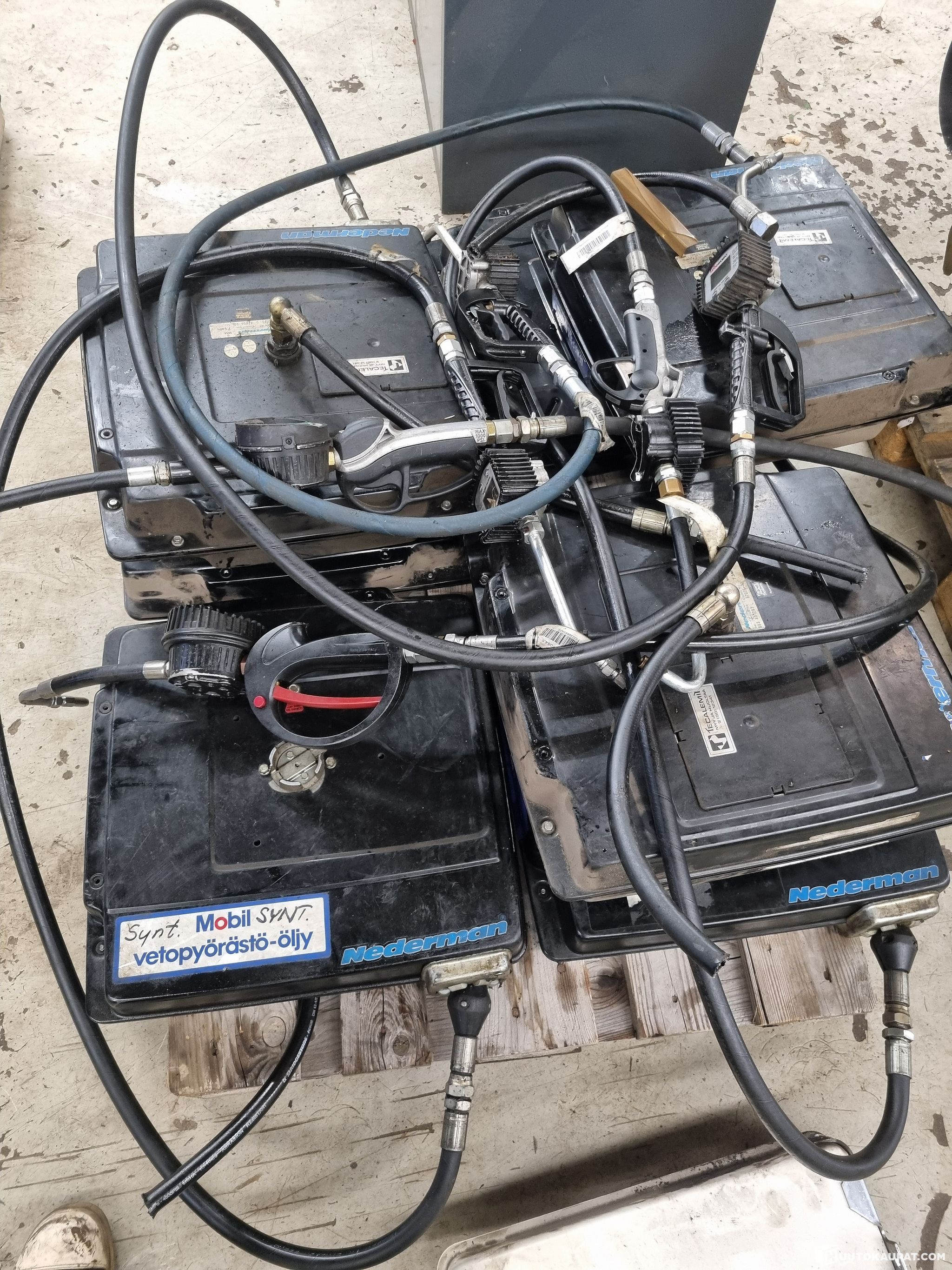 Käytöstä poistettu/ purettu korjaamo käytöstä. 7 kpl voiteluaine keloja, Kuudessa kelassa digitaalliset mittarit mukana, Ei sisällä kiinnitys telineitä.