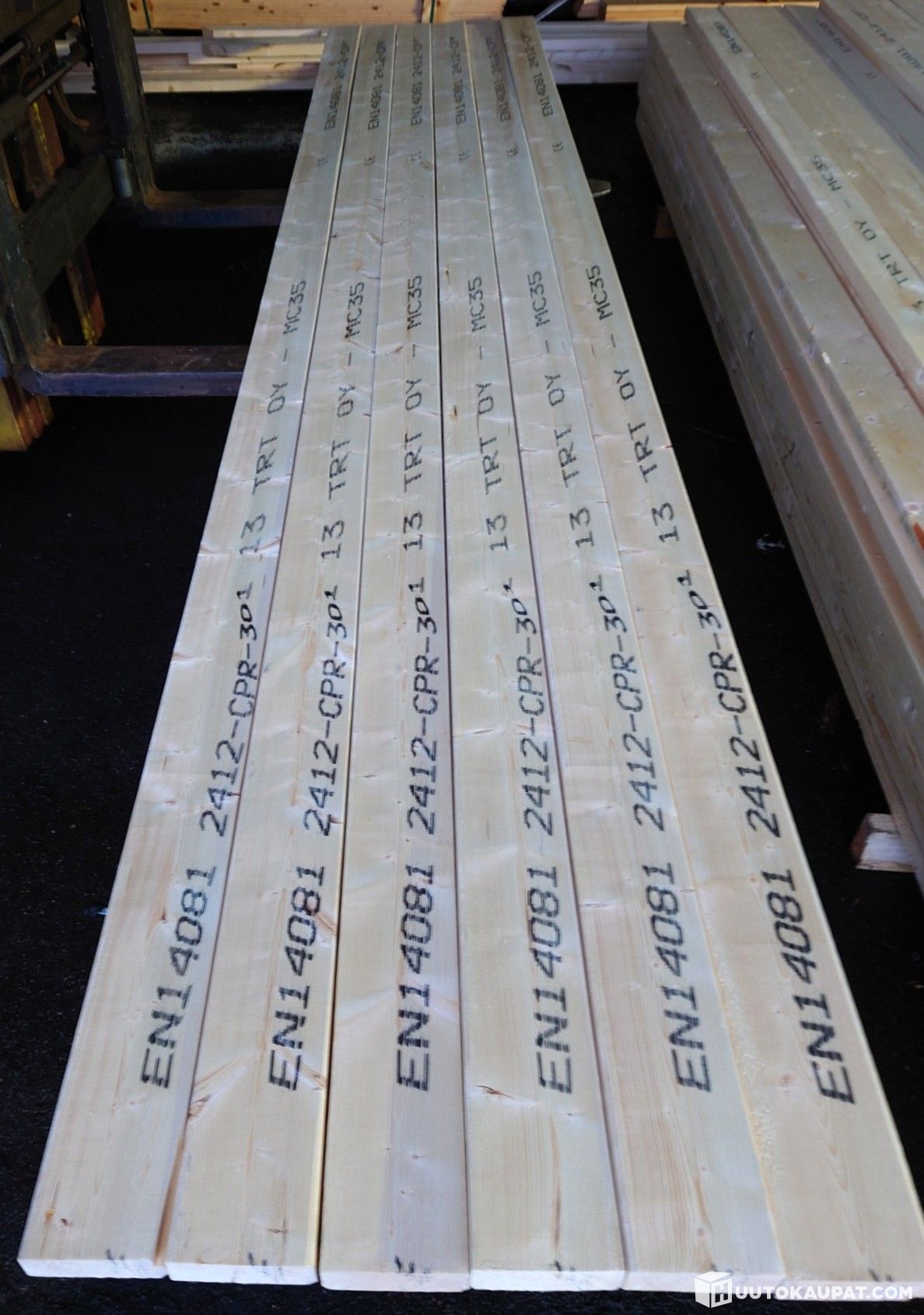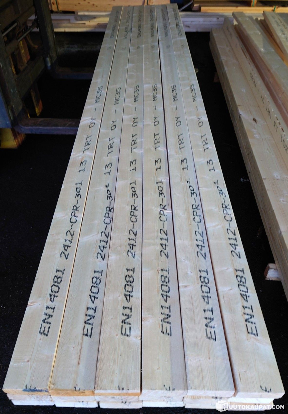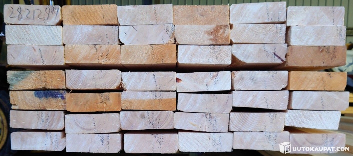 Kuvissa näkyvät huippulaatuiset 42x120 mm kuusilankut. Kaikki ovat koneellisesti lujuuslajiteltuja luokkaan MC 35 ja CE-merkittyjä. Käyvät siis vaativaankin rakentamiseen lujuutensa puolesta. Lankkujen pituudet: 10 kpl a' 3,6 m, 11 kpl a' 3,9 m ja 41 kpl a' 4,2 m.
