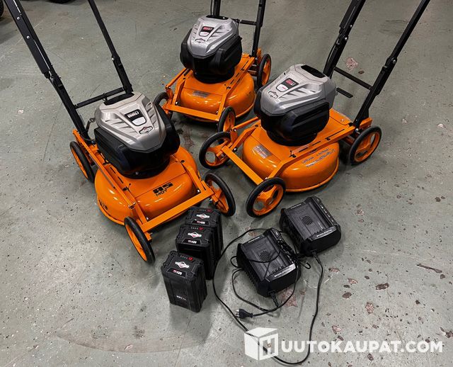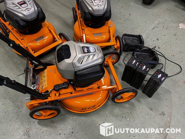 3 kpl AS Motor 420E akkukäyttöisiä ruohonleikkureita Briggs&Stratton 82V moottoreilla. Mukana kaikkiin 1 akku/leikkuri + 2 laturia. Kaikki laitteet toimivat. Yhdellä ajettu enemmän, 2 lähes ajamattomia. Työleveys 42cm. AS Motor ammattilaadun runko. Varateriä ym. löytyy uutena varastosta. Kätevä huoltoasentoon nosto, leikkuukorkeus säädettävissä yhdellä vivulla. Tehokas allemurskaustoiminto