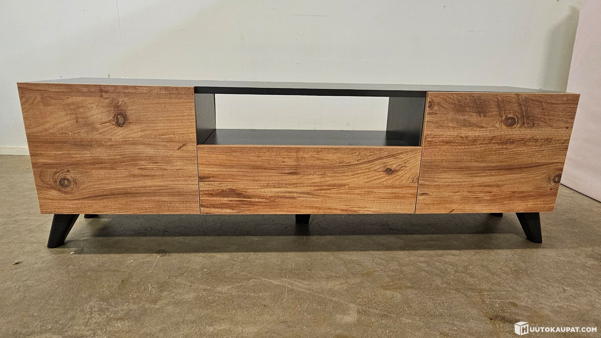 Tv-tason suunnittelussa on otettu huomioon sekä esteettiset että funktionaaliset seikat: avohyllyhylly tarjoaa sopivan tilan laitteille, kun taas suljettu kaappi piilottaa kätevästi pois silmistä kaiken sen, mikä ei tarvitse olla näkyvillä.