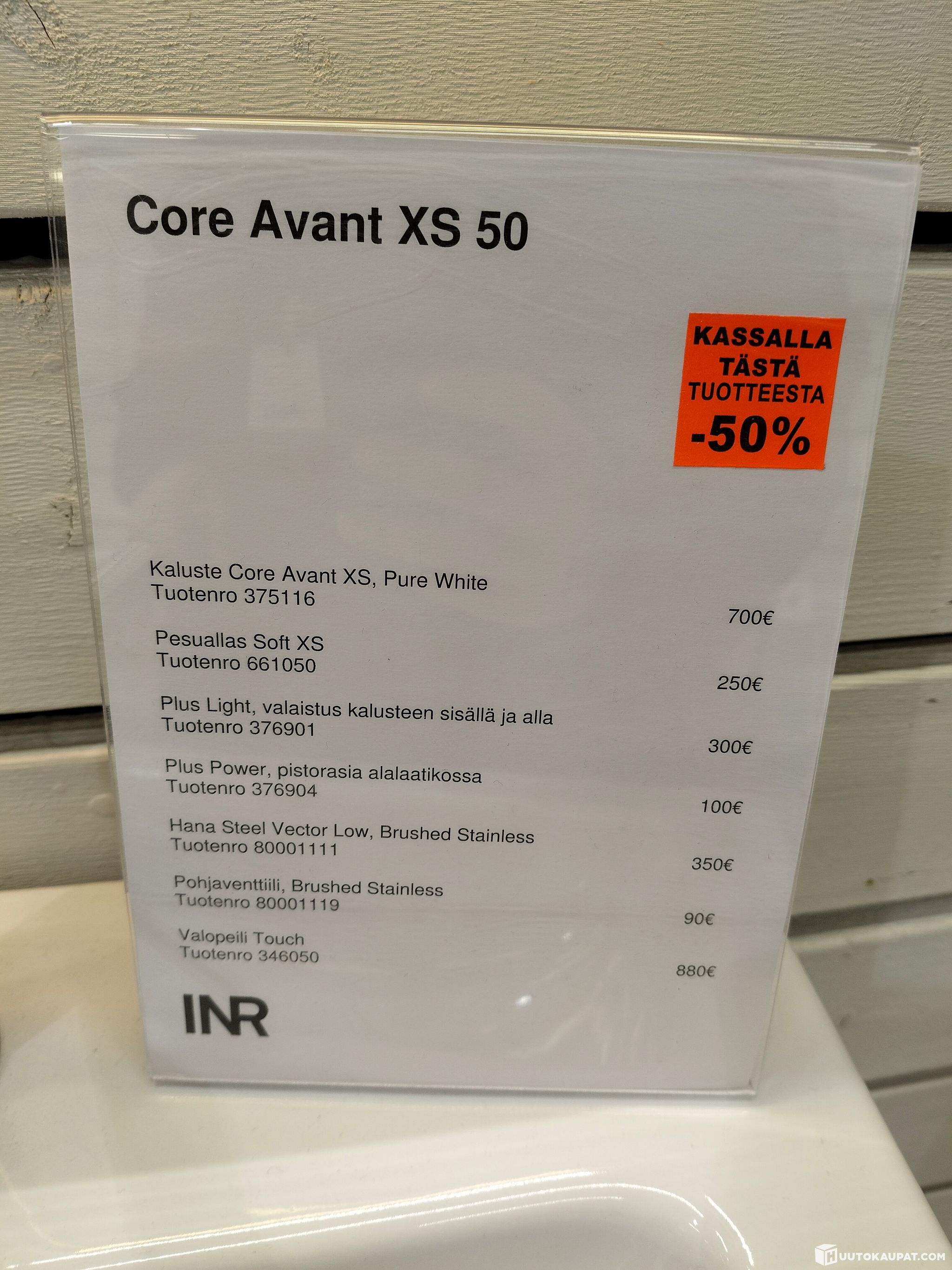 Hanki moderni ja käytännöllinen INR Core Avant XS 50 -kokonaisuus puoleen hintaan! Tämä paketti sopii täydellisesti pieneen kylpyhuoneeseen, jossa halutaan yhdistää skandinaavinen design ja toiminnallisuus.
